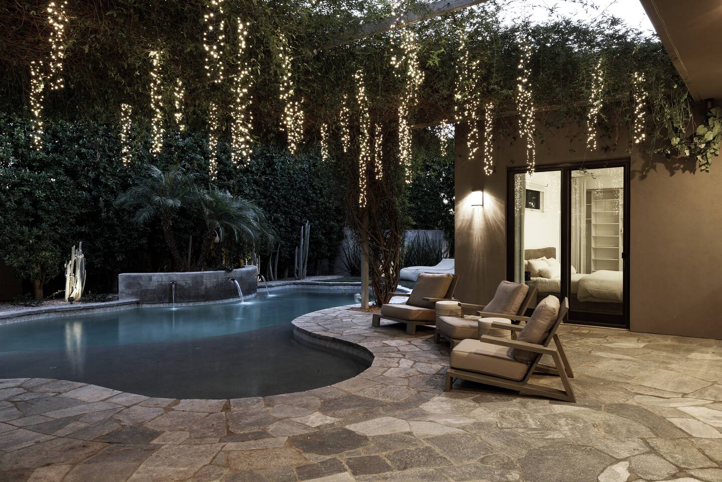 Flagstone floors carry you effortlessly between the indoor and outdoor spaces, creating a flow designed for lingering dinners, laughter with friends and quiet mornings by the pool. Outdoors, towering greenery surrounds a private pool, fire pit, and dining pavilion, creating the feeling of a secluded retreat in the desert. Inside, uncluttered interiors are curated with comfort in mind: well-appointed bedrooms, a chef’s kitchen, and thoughtful details throughout the home, including “a completely stocked kitchen” “a coffee and tea bar with Yeti cups,” and “extras we didn’t even know we needed." Located in a quiet residential neighborhood, The Verdānt is just minutes from Scottsdale Quarter, Kierland Commons, and TPC Scottsdale, with Old Town shops and galleries a short drive away. Every stay can be elevated with curated concierge services such as private chef dinners, in-villa yoga, massage, or wine tastings. TheVerdānt offers the privacy of a vacation rental with the amenities of a five-star retreat. Rental Agreement and deposit required. Pool heating at an additional cost.